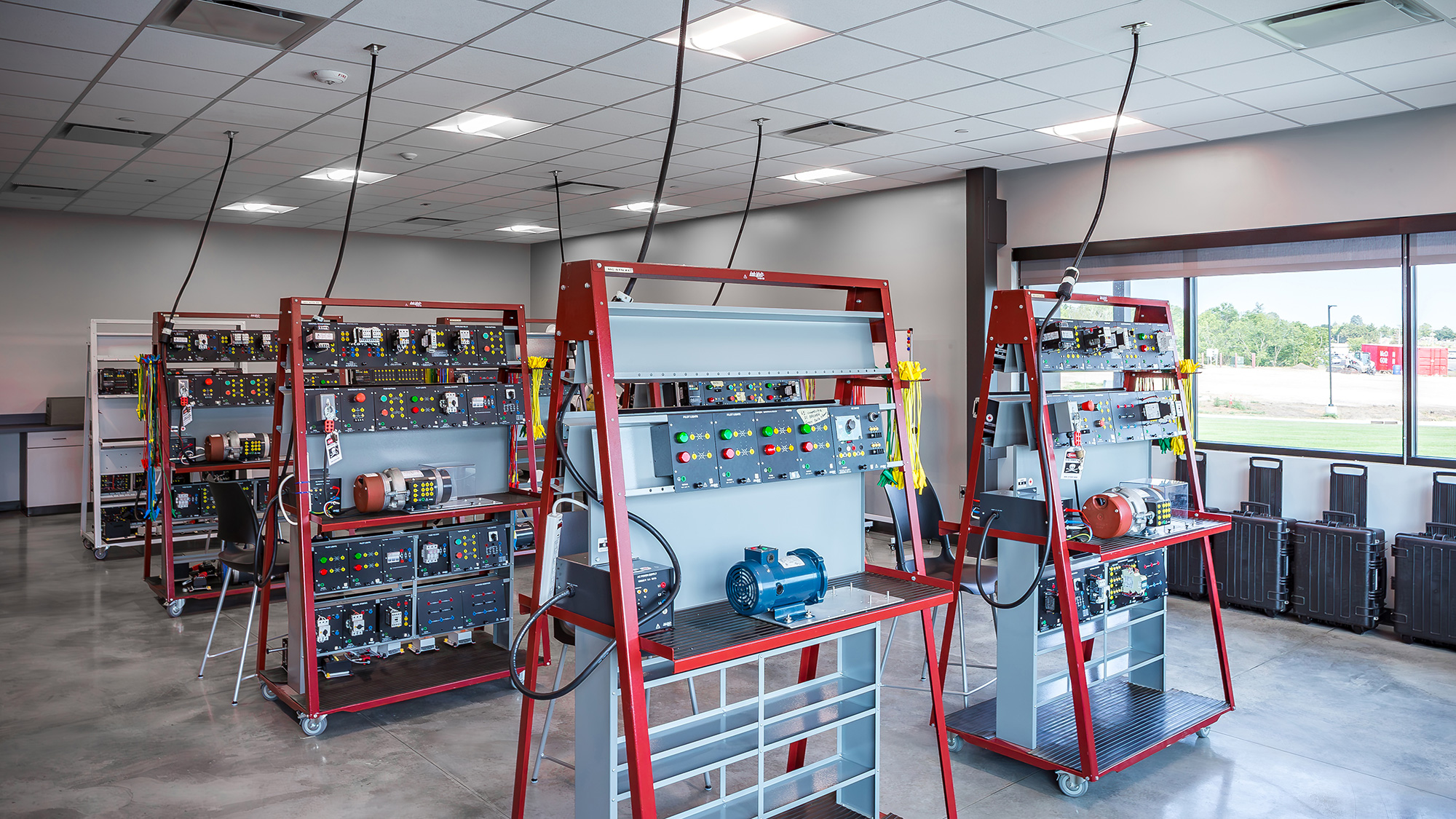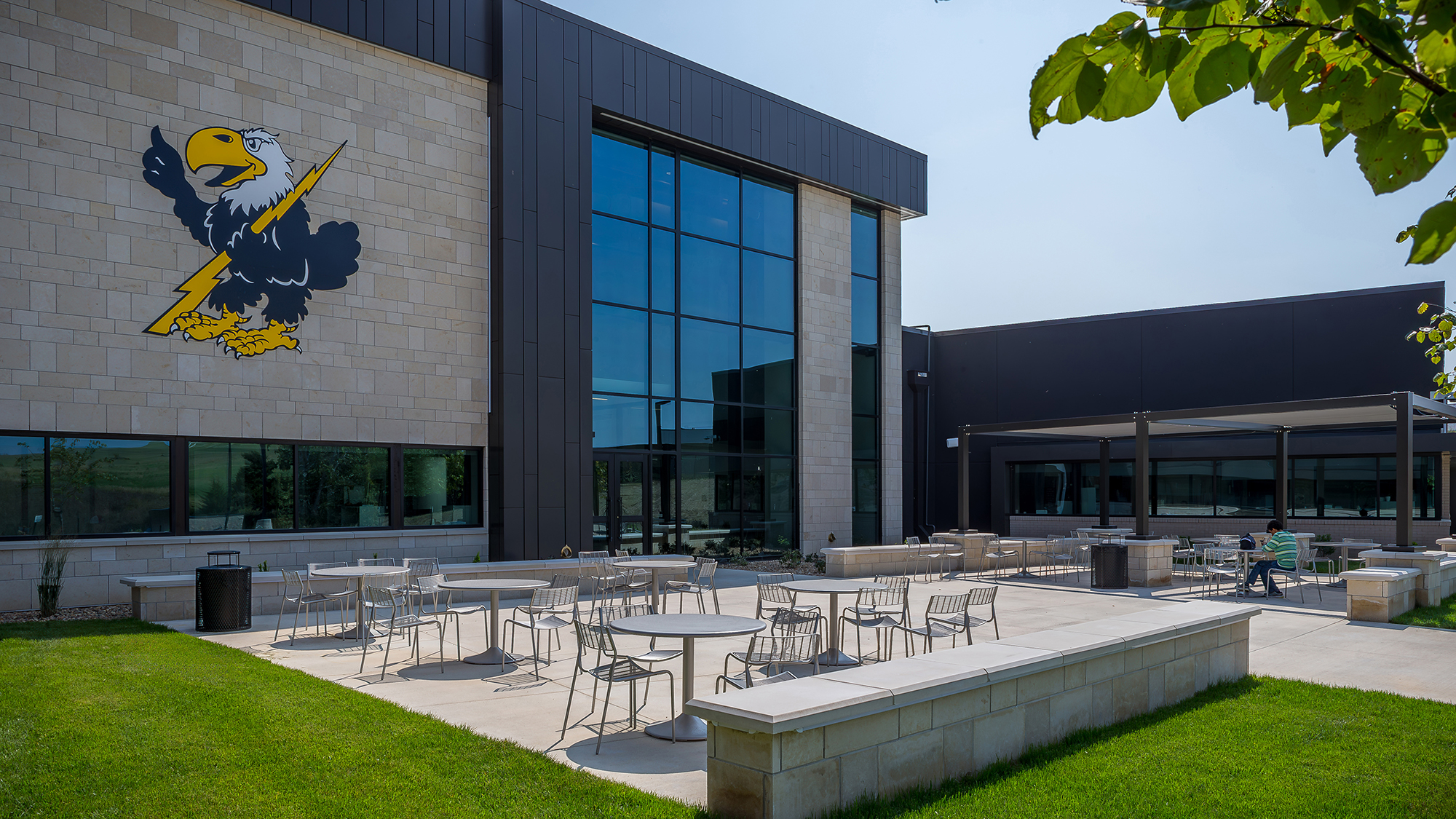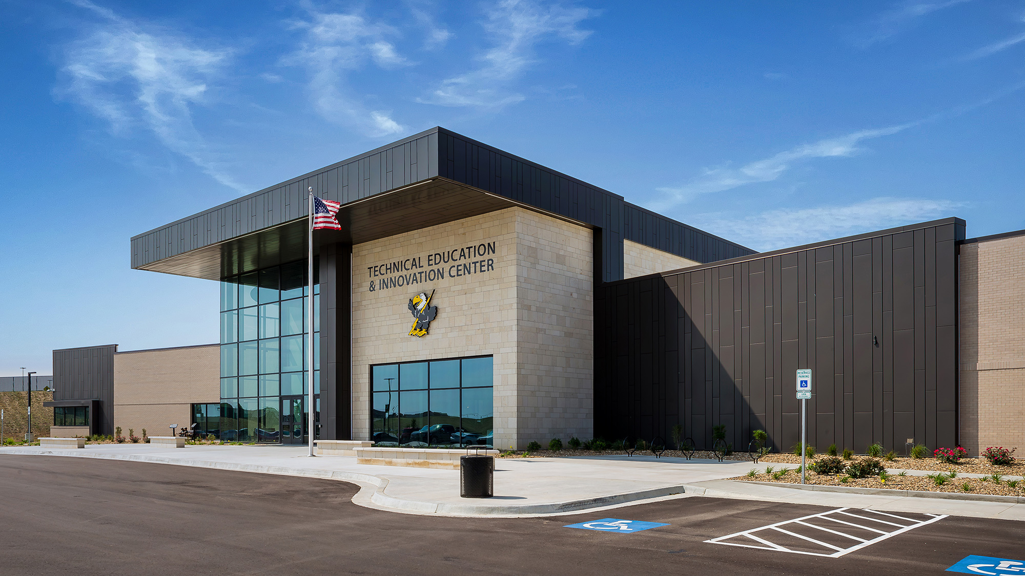 The new single-story building features classrooms, private offices, nursing simulation center, composites lab, welding classroom (with dedicated gas room), workshops, and climb/drone training space all with the intent of training the next generation of skilled workers for critical industries. The building features a tall lobby space to separate the Nursing area from the Renewable Energy and Agriculture/Industrial areas. Nursing inhabits one side of the facility with offices, classrooms, simulation and associated control rooms, teaching area, and briefing spaces. The other portion of the building facilitates the renewable/industrial focus. Several rooms have no ceilings and in one case is multiple stories tall to allow for drone flight and teaching that pertains to servicing wind turbines. Support spaces include restrooms, storage spaces, meeting/conference rooms, laundry room, and break areas. The site design has a monument sign, drop-off area, a large concrete pad area with seating and tables for outdoor functions and classroom work, and an estimated 128 parking spaces with a large space to the north for bio-retention and possible future expansion.