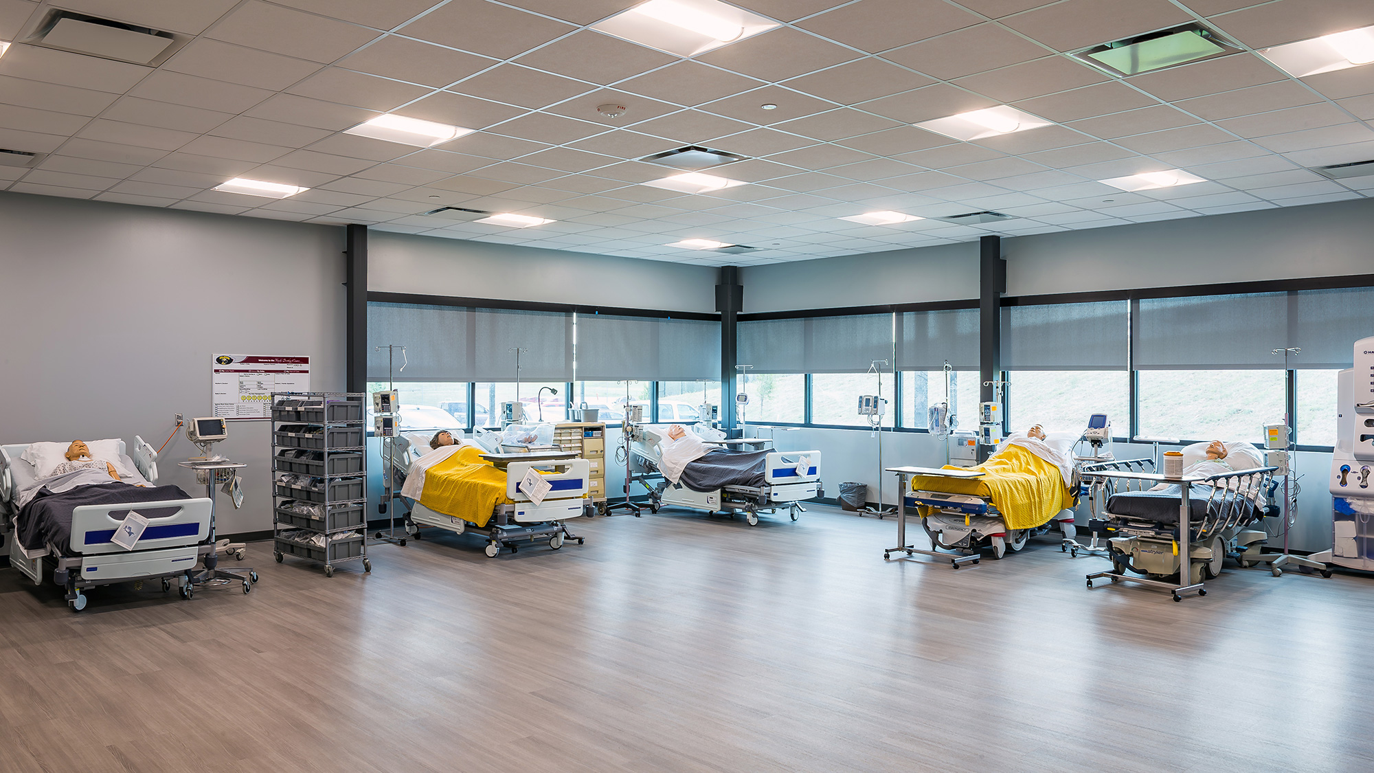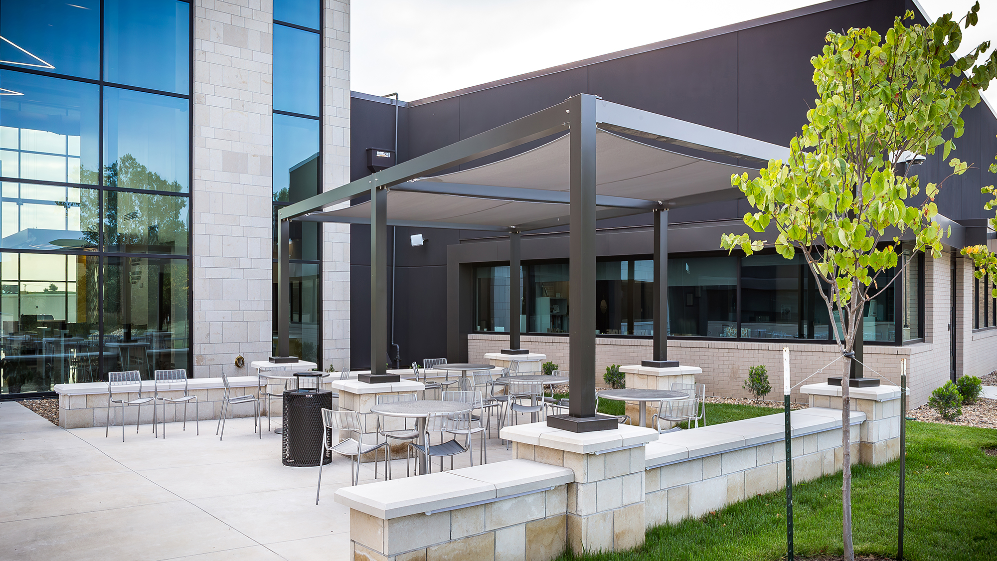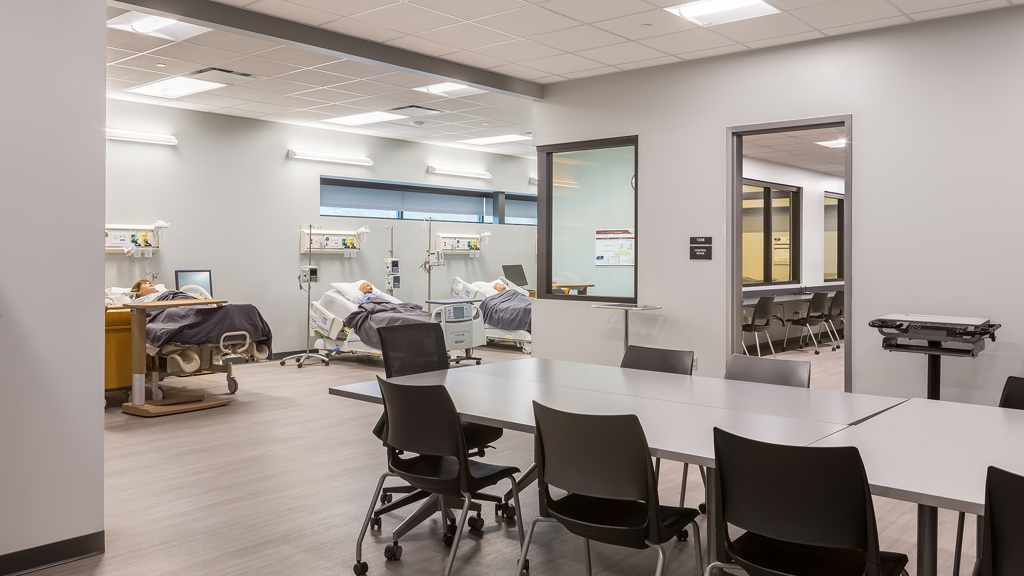 The new single-story building features classrooms, private offices, nursing simulation center, composites lab, welding classroom (with dedicated gas room), workshops, and climb/drone training space all with the intent of training the next generation of skilled workers for critical industries. The building features a tall lobby space to separate the Nursing area from the Renewable Energy and Agriculture/Industrial areas. Nursing inhabits one side of the facility with offices, classrooms, simulation and associated control rooms, teaching area, and briefing spaces. The other portion of the building facilitates the renewable/industrial focus. Several rooms have no ceilings and in one case is multiple stories tall to allow for drone flight and teaching that pertains to servicing wind turbines. Support spaces include restrooms, storage spaces, meeting/conference rooms, laundry room, and break areas. The site design has a monument sign, drop-off area, a large concrete pad area with seating and tables for outdoor functions and classroom work, and an estimated 128 parking spaces with a large space to the north for bio-retention and possible future expansion.