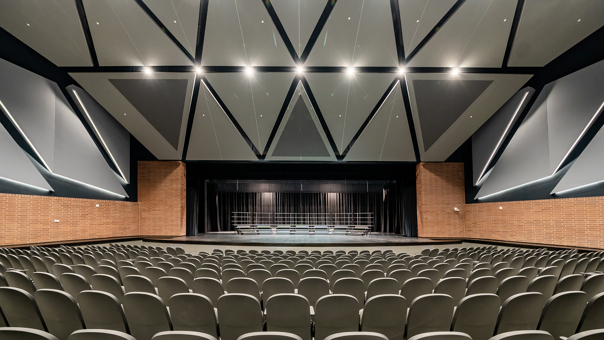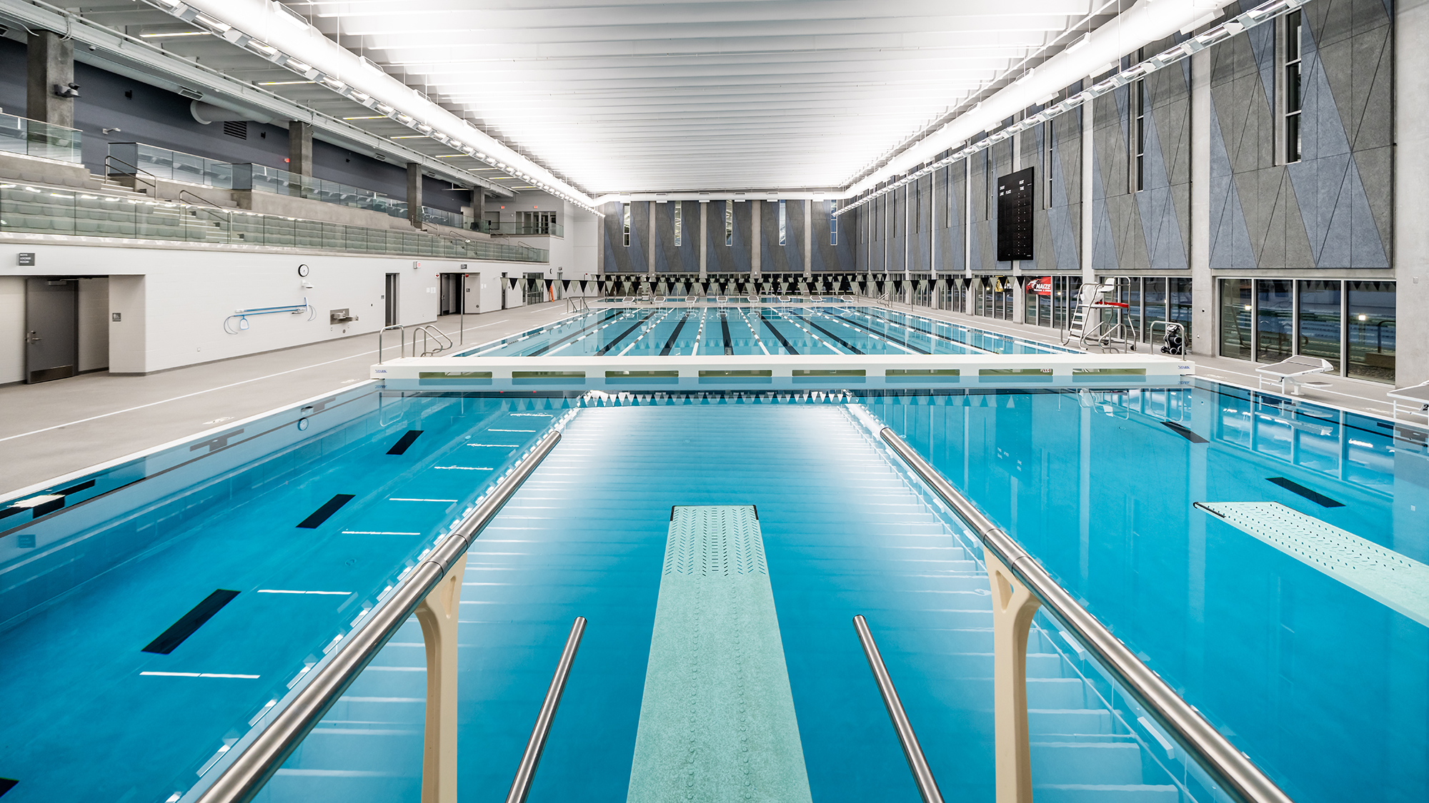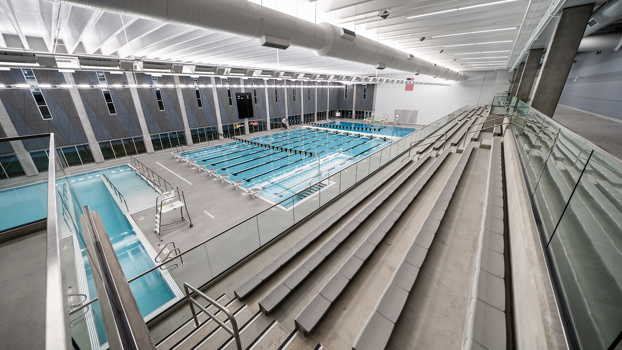 The mixed-use facility consists of a 2-story lobby entry that leads into a 1,200-seat auditorium and the competition-style natatorium. The auditorium features a balcony that allows for district fine arts performances such as orchestra, band, vocal concerts, and theatrical performances. The natatorium features an 8-lane pool with a dive well and zero entry accommodations. The facility also includes approximately 300 seats for spectators, a locker room, and office spaces located above. PEC was responsible for the electrical design and materials testing for this project.