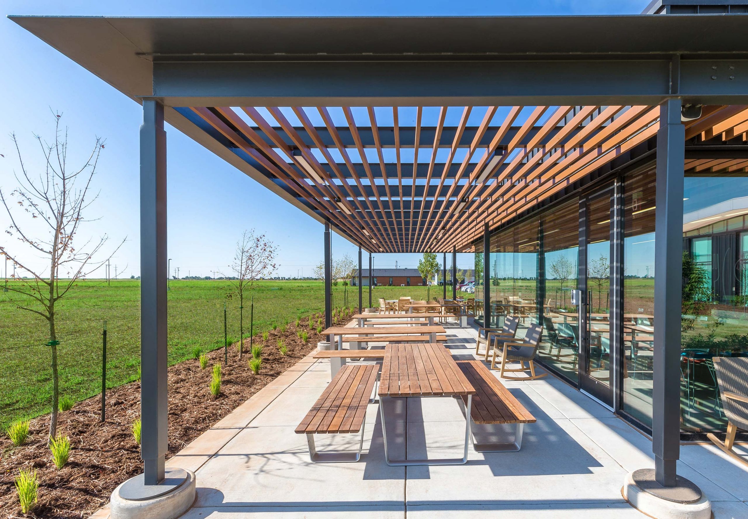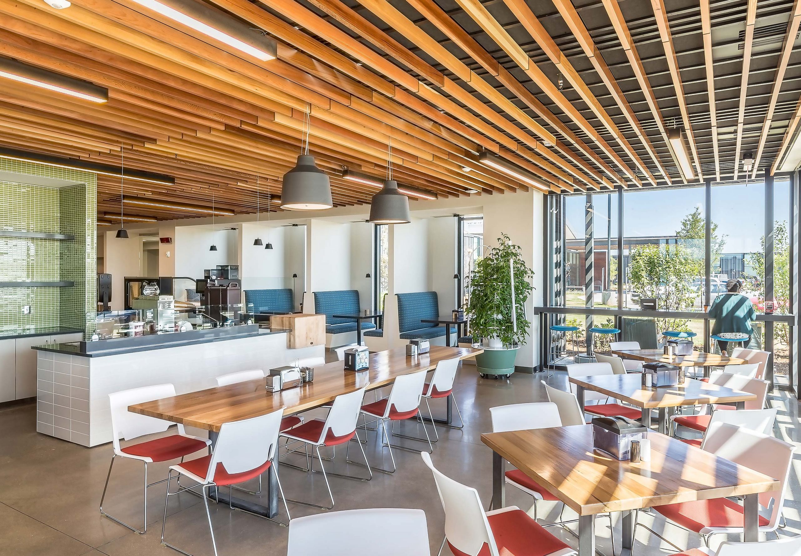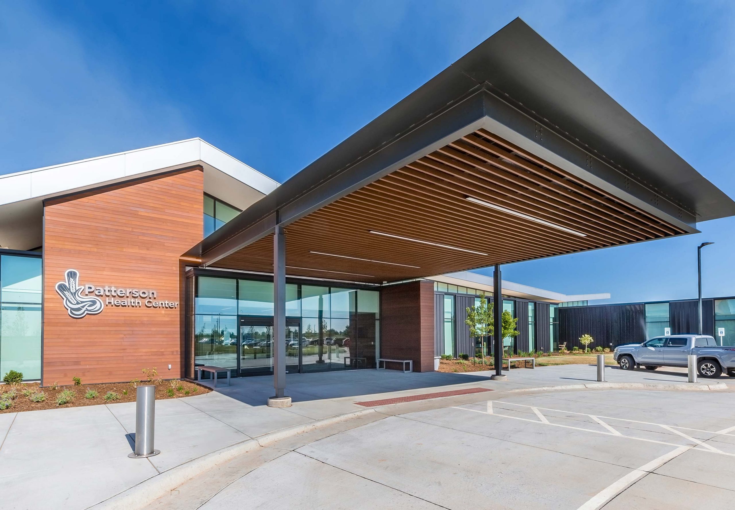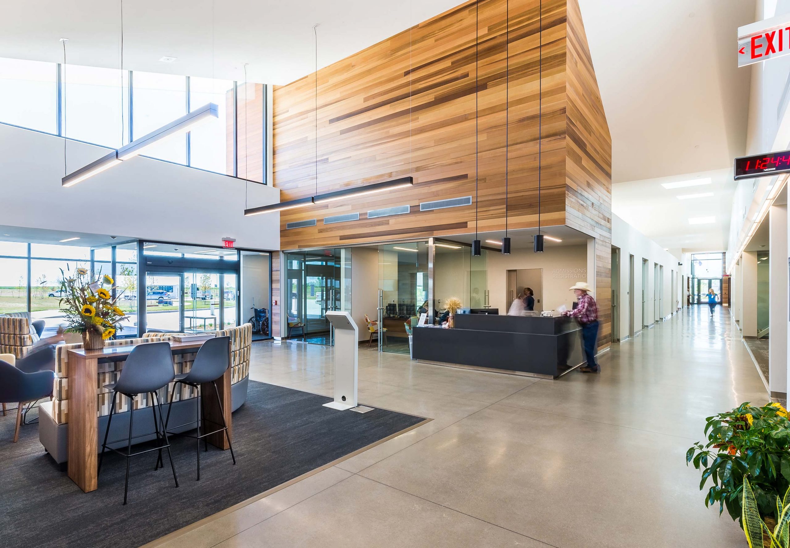 The new centrally located critical access hospital has 16 inpatient beds, 22 exam rooms, a large emergency department with 2 trauma bays, physical therapy and rehab center, and a wellness center. The rural hospital includes a cafe that serves the public and the hospital as well as an open community center, public green space for community events, a community garden, and various trails.
