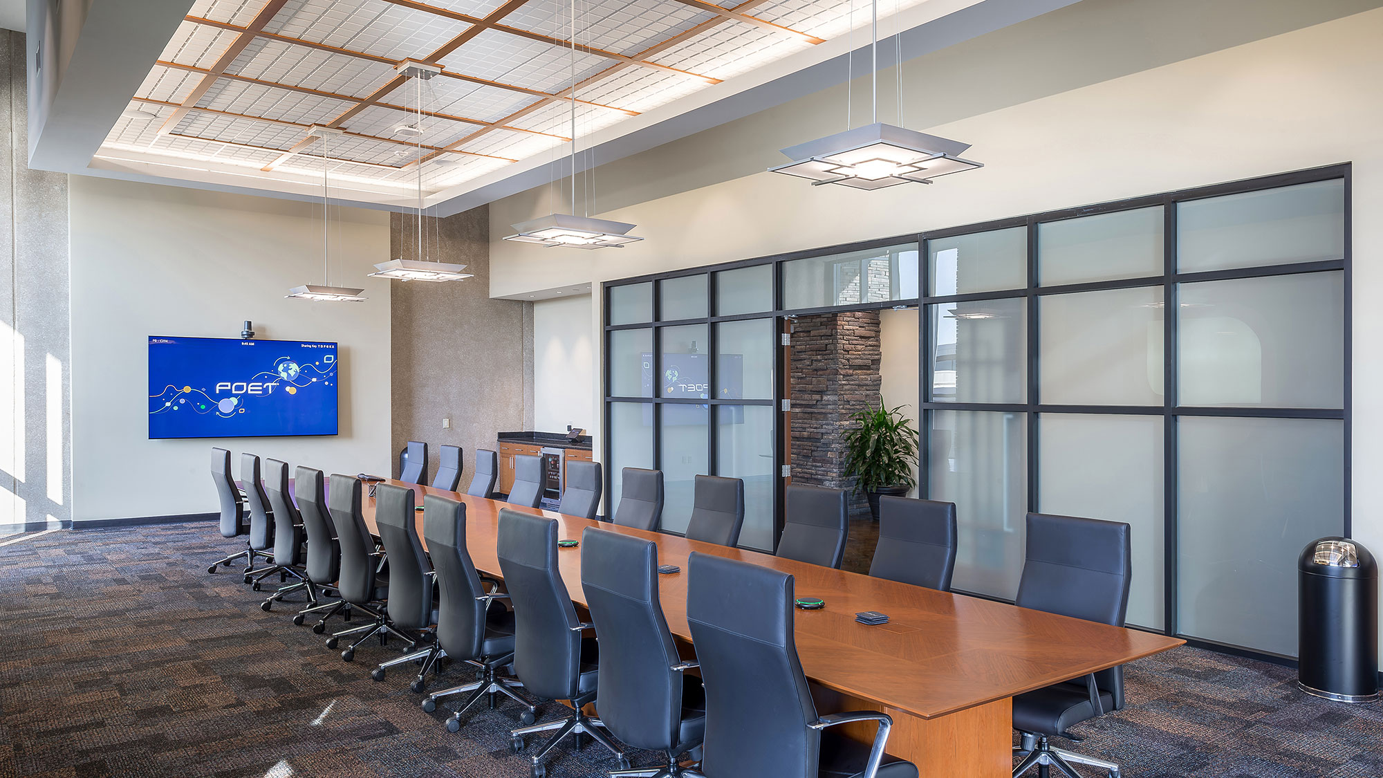 The POET expansion was designed with the future in mind. The new 37,500 SF additions will accommodate major growth for the client: 192 workspaces, 100 parking stalls, multiple conference rooms, a new break room to serve the entire campus of offices, and an outdoor lounge space.