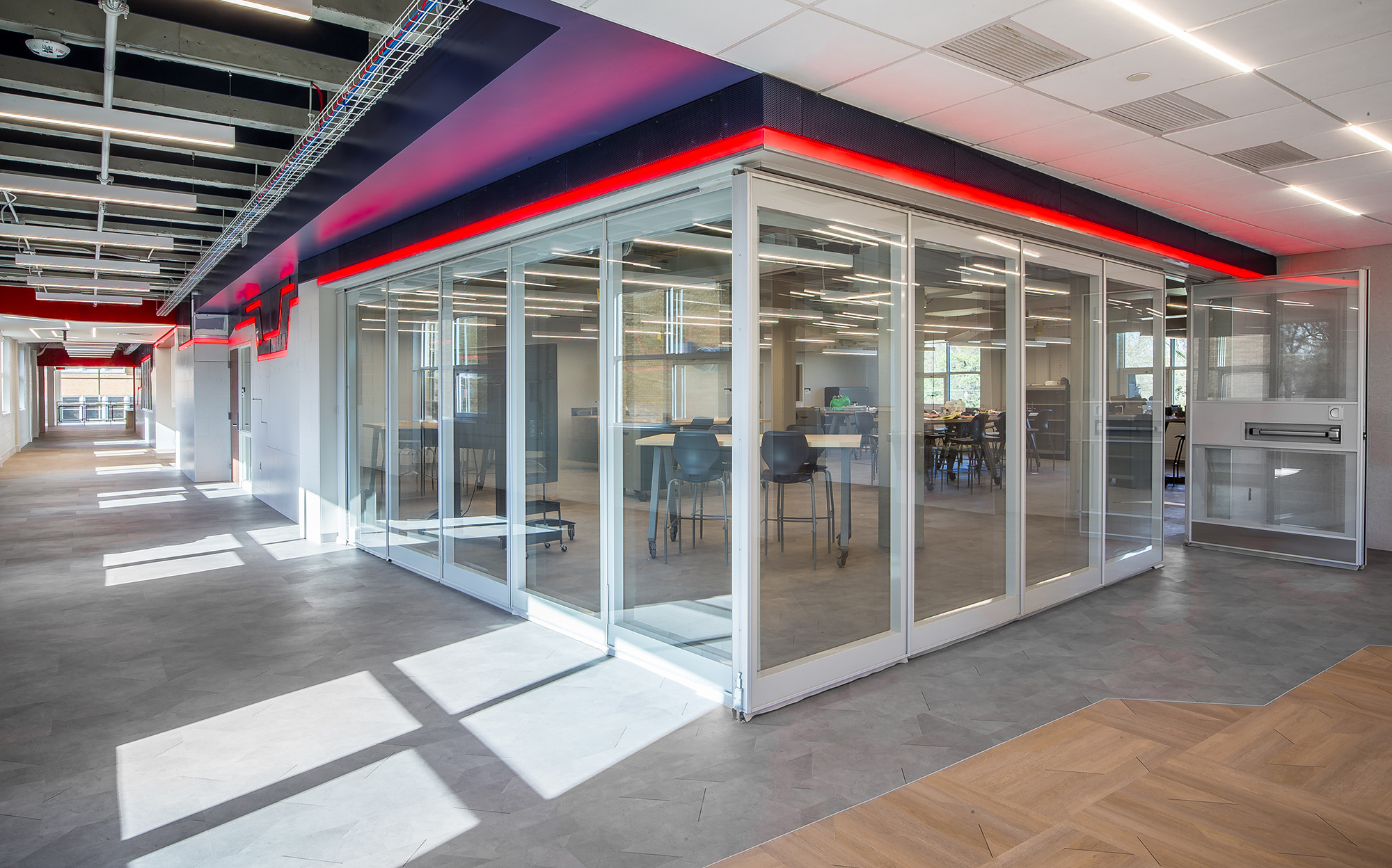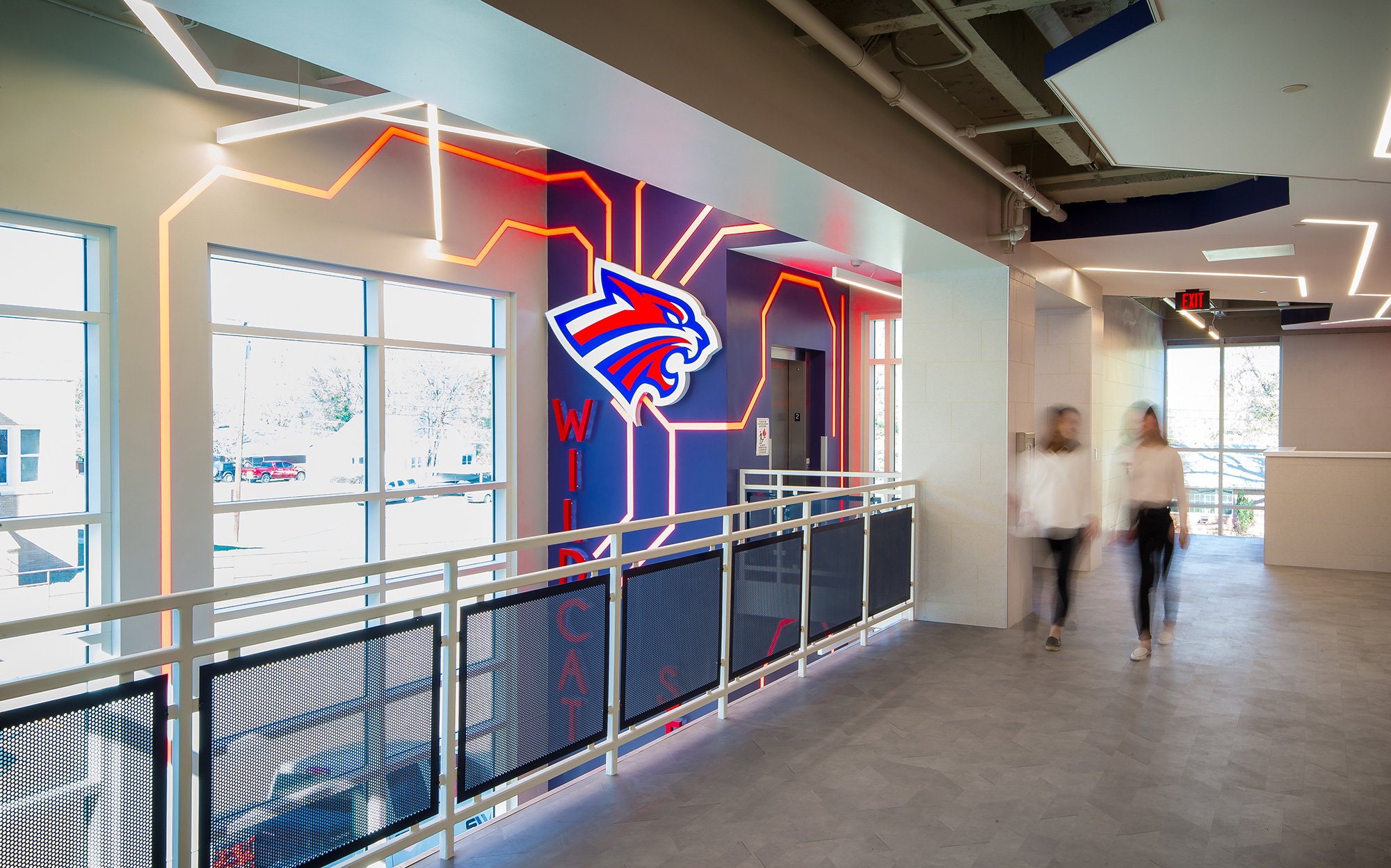 The wing of the high school slated for renovation posed an interesting challenge. It was constructed before many of the modern technologies and conveniences used today were available, which meant converting the existing 2-pipe mechanical system to a more modern 4-pipe system. The HVAC system required an innovative design to work within the limited floor-to-floor height of the building. PEC’s team also designed a new electrical distribution system to handle the increased load capacity. A major showpiece, the entryway features a lighted Wildcat design made to mimic a circuit board. Every discipline involved in the project worked in close coordination to maximize the amount of usable learning space.