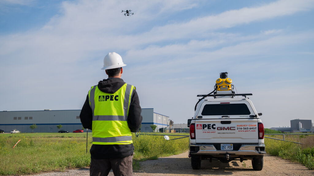 - Drone – PEC utilizes drones for fast, efficient aerial mapping and topography. Drones are a great option for rapid data collection across large areas. PEC’s drone pilots are FAA part 107 certified for commercial operations.